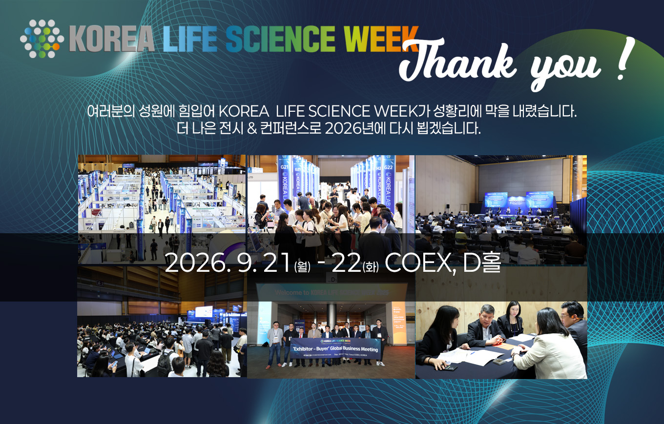 KOREA LIFE SCIENCE WEEK 2025가 여러분의 성원에 힘입어 성공적으로 종료되었습니다. 많은 성원에 감사드리며, 지난 이틀간 전시장을 방문 해 주신 관람객 인원을 안내드립니다. 9. 30 (화) - 2,327명 10. 1(수) - 2,439명 총 4,765명 방문 더 나은 모습으로 2026년에 찾아뵙겠습니다. (2026년 9월 21일(월) - 22(화) 코엑스 D홀) 감사합니다. 전시사무국 (주)경연전람
